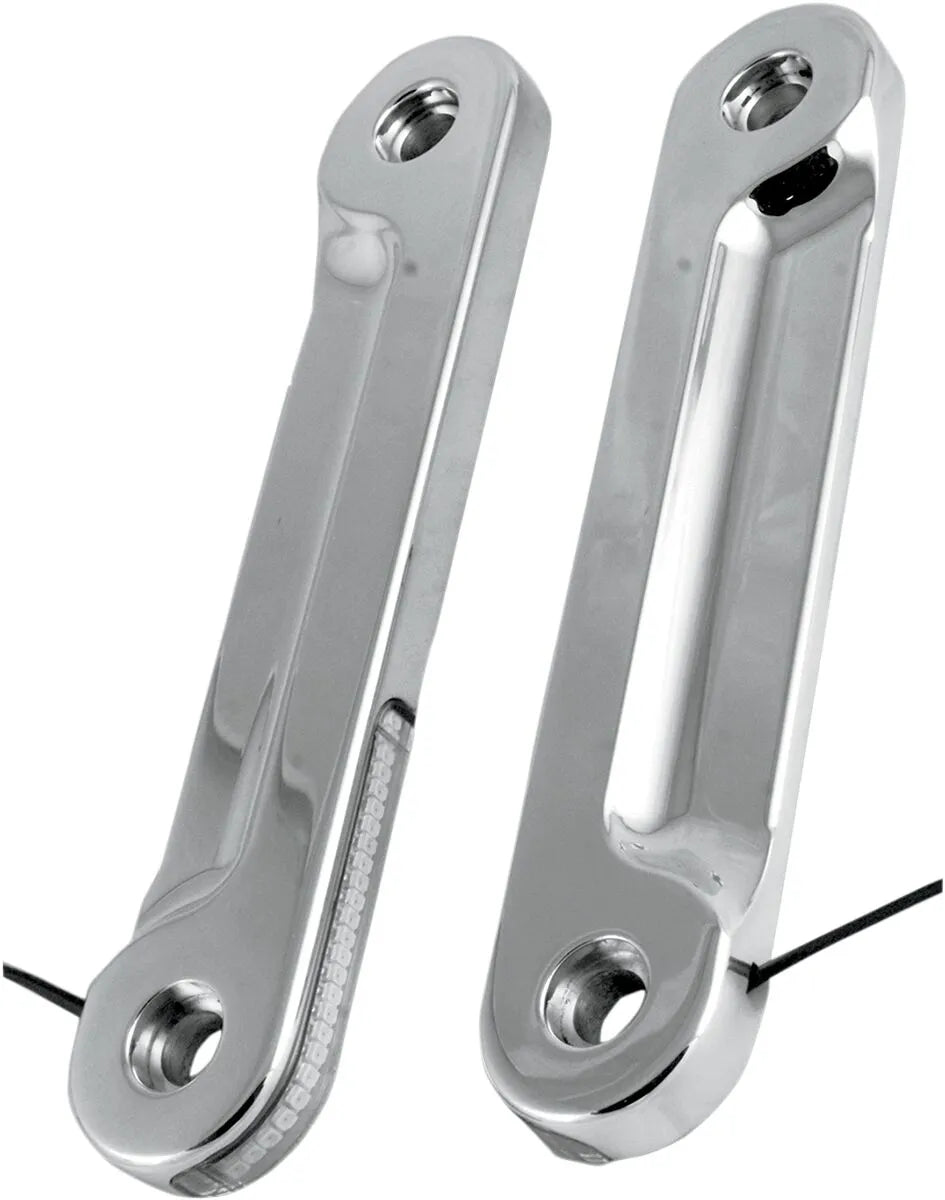 The Alloy Art LED Front Turn Signals feature a CNC-machined aluminum housing, providing exceptional durability and a premium look. The injection-molded polycarbonate lens ensures optimal light transmission and resistance to impacts. These single-function LED turn signals deliver a super-bright amber light output, enhancing your safety and visibility. Designed and manufactured in the USA, these lights reflect Alloy Art's commitment to quality and craftsmanship. The chrome housing adds a touch of classic style while ensuring long-lasting protection against the elements. Easy to install on the front of your motorcycle, these turn signals offer a straightforward way to improve both the look and safety of your ride. Operates on 12V systems. These bar-shaped turn signals provide focused light output.