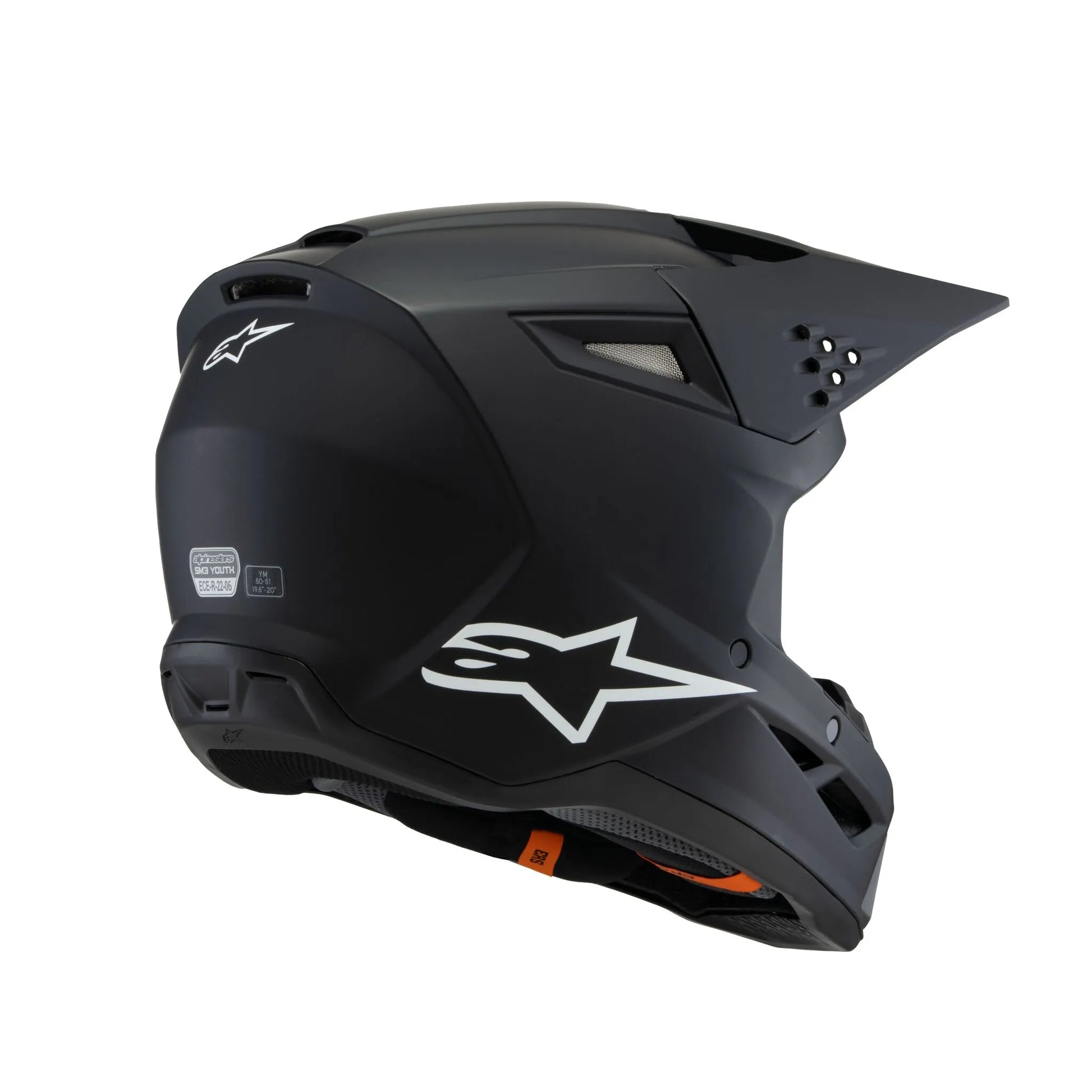The SM3 Youth Helmet's lightweight outer shell is constructed from a technologically advanced impact-resistant thermoplastic, available in three sizes (Youth Small, Youth Medium, and Youth Large). The thermo-injected shell incorporates a special polymer blend with varying degrees of thickness, engineered to deliver the optimal combination of impact protection and light weight. Multiple density inner liner ensures the helmet is equipped with the correct density in the correct area for enhanced impact absorption, while also helping reduce overall weight. The inner and outer surfaces are engineered to minimize the effects of oblique impacts. Alpinestars' patented low friction coating is applied to the inner part of the main EPS liner to reduce rotational acceleration forces. Ventilation is maximized thanks to 10 inlets and seven exhaust ports, and the visor is designed to direct air into the ports for enhanced airflow. The SM3 Youth helmet weighs 1060g.Features & highlights