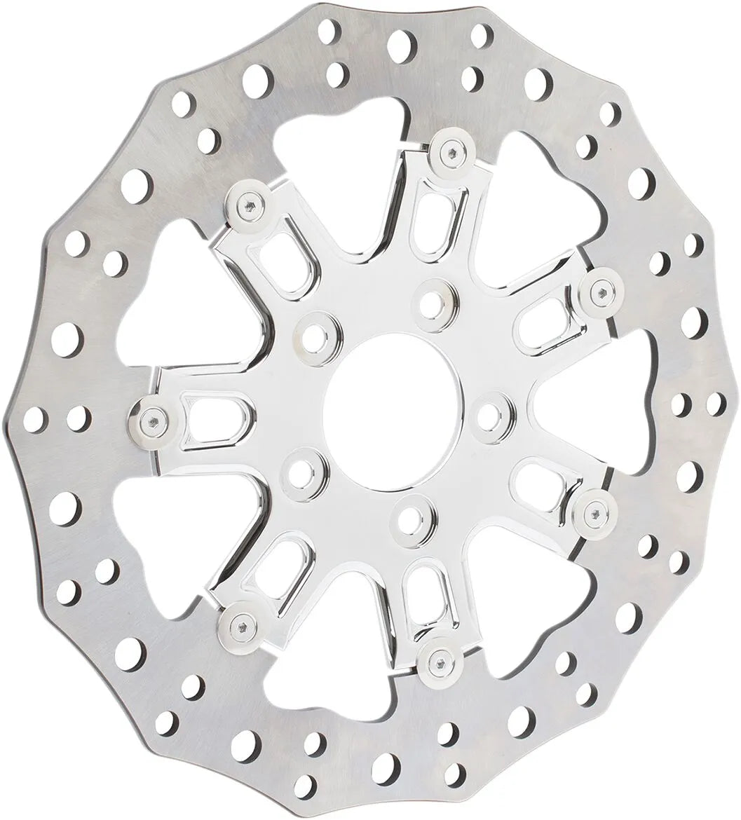 The Arlen Ness Two-Piece Floating Brake Rotor is meticulously crafted to ensure high performance and longevity. The outer brake disc is constructed from premium 420 stainless steel, precisely drilled and laser-cut to maximize friction while maintaining exceptional durability. The inner carrier is CNC-machined from aircraft-quality billet aluminum, offering a lightweight yet robust foundation. This floating design allows for optimal heat dissipation, reducing the risk of brake fade and ensuring consistent braking performance under demanding conditions. This rotor is designed to work seamlessly with Arlen Ness, factory, and aftermarket wheels that accept 5-bolt hub-mounted HD brake rotors, making it a versatile upgrade for a wide range of motorcycles. Enhance your motorcycle's stopping power and aesthetic appeal with this high-quality brake rotor.