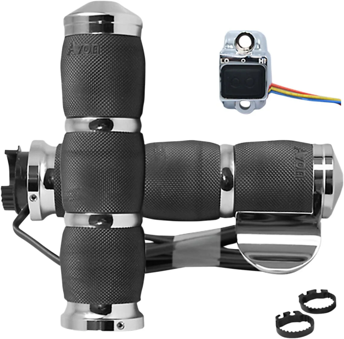 Avon Grips Heated Grips are meticulously crafted in the USA using premium Kraton rubber. The grips feature a soft, serrated texture that provides an excellent grip, ensuring you maintain control of your motorcycle even in challenging conditions. The integration of a throttle boss enhances comfort and reduces fatigue during long rides. These grips are finished with 6061 billet aluminum spike end caps and collars, adding a touch of style and durability. Designed for 1" handlebars, these grips offer easy installation and a secure fit, making them a perfect upgrade for any motorcycle enthusiast seeking enhanced comfort and performance. The black and chrome finish ensures they look great on any bike.