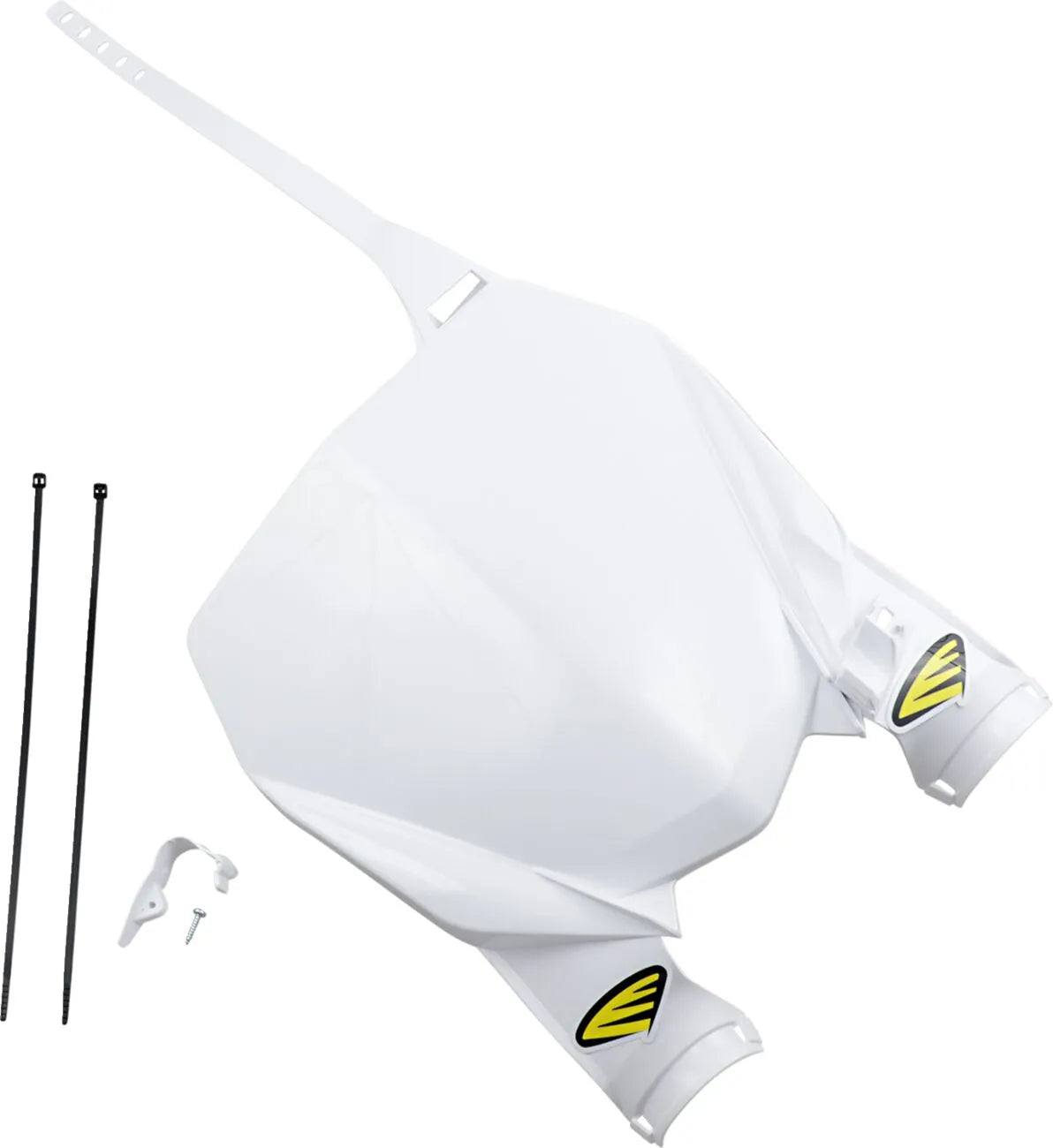 Enhance your bike's aesthetics and functionality with the Cycra Stadium Number Plate. Its ultra-lightweight and slim profile doesn't compromise on durability, making it ideal for demanding riding conditions. The number plate includes a Works cable guide and a crossbar strap for secure and organized cable management. Designed for top mounting, it wraps securely around the fork tubes for a snug fit. Older models feature an upper mounting bracket to accommodate front mount triple clamps, providing versatility across different bike setups. The included white and black screens allow for customization to match your bike's color scheme. Proudly made in the U.S.A., this number plate guarantees high-quality construction and performance.