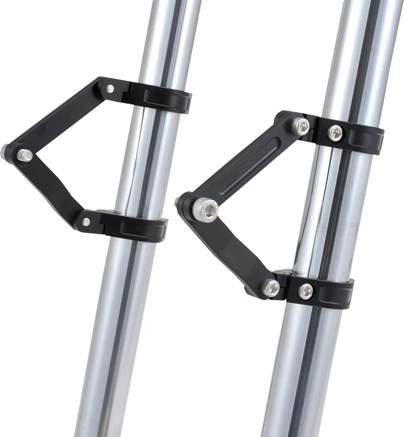 The Daytona Headlight Bracket Set is expertly crafted from CNC machined aluminum and finished in a sleek black. This adjustable, dual-axis design provides exceptional versatility, allowing you to fine-tune the headlight position to achieve the perfect beam angle and aesthetic. The fork clamps feature vertical adjustability, enabling forward and backward headlight placement. Joints on all four clamps provide variable width adjustment, ensuring parallel brace alignment. This kit enhances both the appearance and functionality of your motorcycle. Easy to install and built to last, the Daytona Headlight Bracket Set offers a premium solution for customizing your ride.