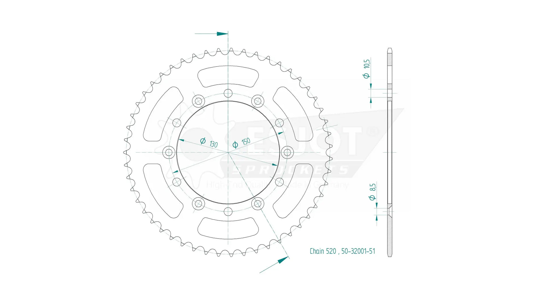 The Esjot Standard Sprocket Rear 520 is engineered with a special steel QSTE460 and finished with a specialized surface treatment, ensuring it stands up to wear-intensive conditions. Manufactured in Germany, each sprocket features precise toothing using the Diamond Cut 2.0 process, guaranteeing optimal chain engagement and power transmission. The black finish not only looks great but also enhances corrosion resistance. With concentricity and axial run-out tolerances of less than 0.1 mm, this rear sprocket provides smooth and efficient performance, making it an ideal choice for enthusiasts and professionals alike. Upgrade to Esjot and experience the difference that quality and precision make.