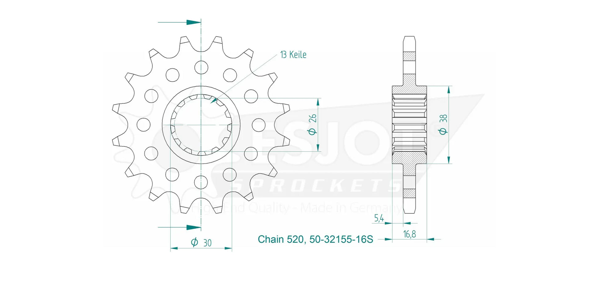 Crafted from special 16MnCr5 steel and featuring high-quality case hardening, the Esjot front sprocket provides exceptional strength and resistance to wear, making it perfect for challenging conditions across all riding environments. Precision gearing, achieved through state-of-the-art CNC machining, guarantees a precise fit on the drive shaft. Weight optimization via lightening holes does not compromise performance; instead, it enhances responsiveness. With concentricity and axial run-out tolerances under 0.1 mm, this sprocket ensures smooth and efficient power transfer. Specifically optimized for racing applications, the Esjot 520 Sport Sprocket delivers unparalleled performance and reliability. Built to last and improve your motorcycle's drivetrain, it's the ideal upgrade for enthusiasts and professionals alike. Proudly 100% Made in Germany.