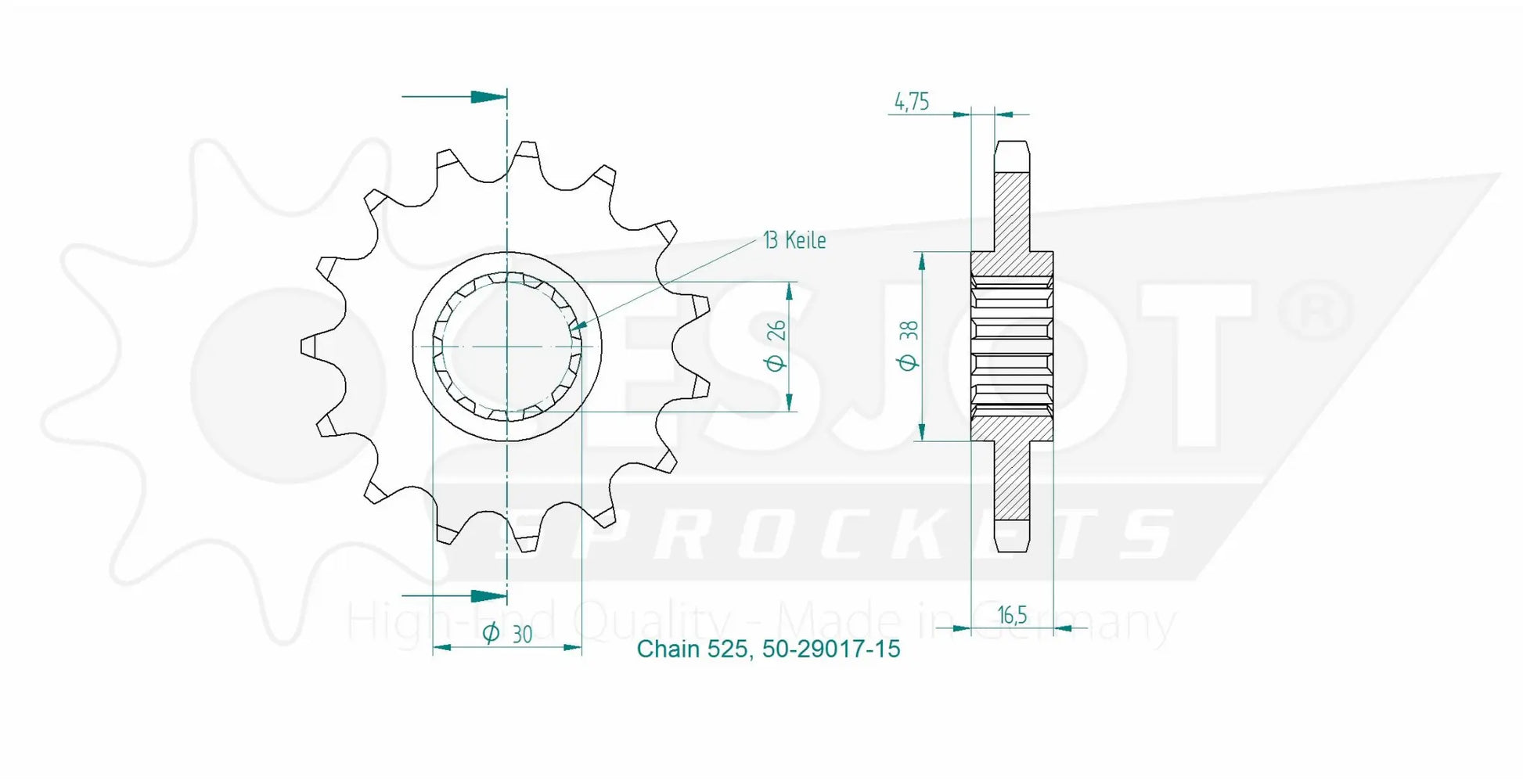 Crafted from a special high-strength steel and featuring premium case hardening, this front sprocket provides unparalleled strength and resistance to wear. The precise gearing ensures optimal power transfer and smooth operation, even under the most challenging conditions. Manufactured using advanced CNC automatic lathes and state-of-the-art broaching machines, the Esjot front sprocket guarantees a precise fit on the drive shaft with concentricity and axial run-out tolerances of less than 0.1 mm. Experience the reliability and performance of a 100% German-made product with the Esjot 525 front sprocket. Upgrade your motorcycle's drivetrain with confidence, knowing you're using a sprocket built to last.