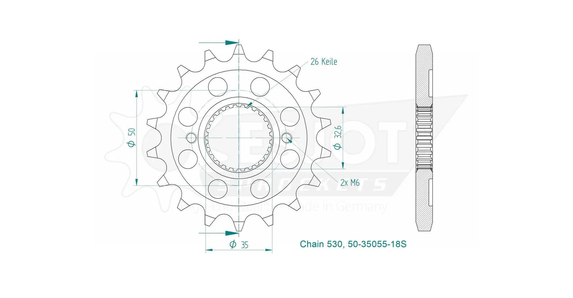 Esjot front sprockets are world-renowned for their quality and performance, making them a top choice for enthusiasts and professionals alike. Constructed from special 16MnCr5 steel, this 530 front sprocket undergoes high-quality case hardening and precise gearing, ensuring exceptional strength and longevity. The weight-optimized design, featuring lightening holes and additional twist-in, maximizes performance without compromising reliability. Specifically optimized for racing applications, this countershaft sprocket minimizes weight without negatively impacting running performance. Manufactured on CNC automatic lathes and state-of-the-art broaching machines, the Esjot sprocket guarantees a precise fit on the drive shaft, with concentricity and axial run-out tolerances of less than 0.1 mm. Upgrade to Esjot and experience the pinnacle of sprocket technology.
