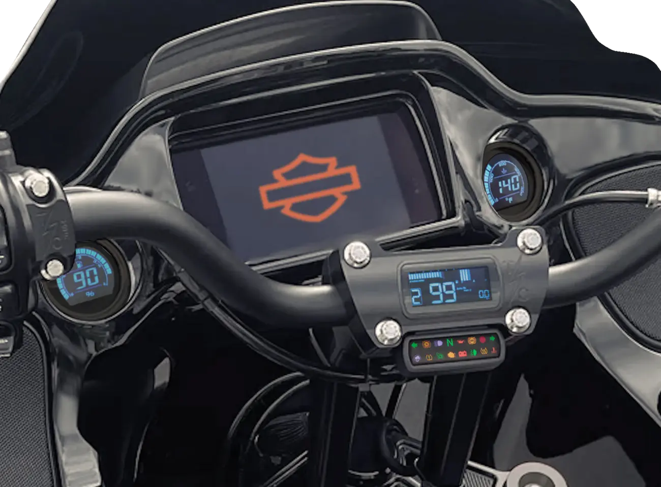 The Koso D2 Gauge Kit provides crucial information at a glance, including engine temperature, battery voltage, tire pressure, and gear indicator. A complete system of indicator lights lets you closely monitor your motorcycle’s vitals. The gauge fits directly into the stock harness and seamlessly integrates with the CANBUS system for hassle-free installation. The 8-color changeable LCD display allows for customizable viewing, enhancing visibility and matching your bike's aesthetics. The D2 Gauge measures 3-7/16" L x 1-1/16" W x 2-5/8" H. The add-on kit, which includes a fuel level and engine temperature meter, measures 2-3/4" in outside diameter and 1-3/4" in depth. Experience enhanced monitoring and control with the Koso North America D2 Gauge Kit.