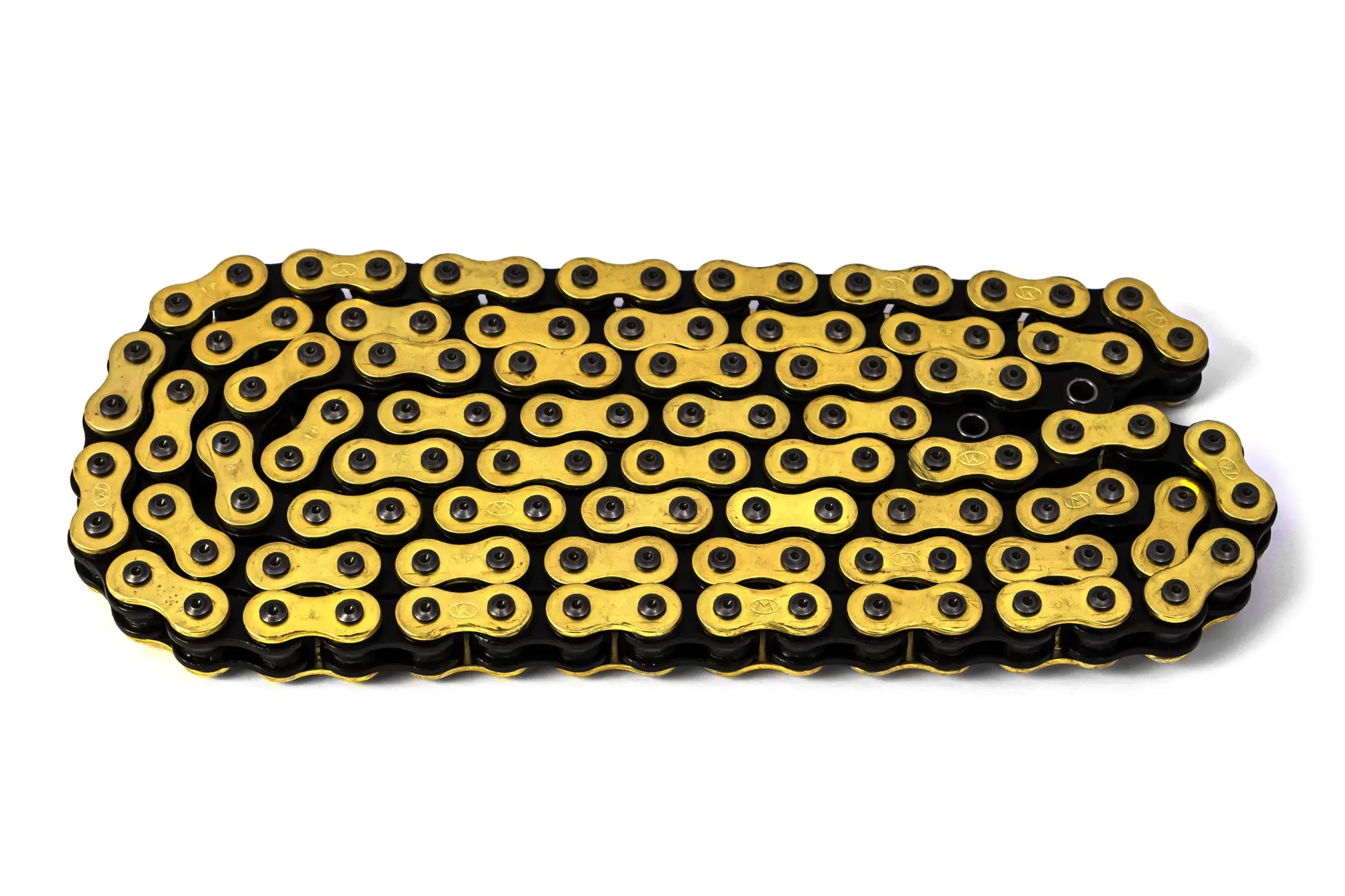 The Moto-Master 520 GPX drive chain is designed to withstand the rigors of off-road riding. Featuring a low-weight X-ring design, this chain minimizes friction and maximizes power transfer. The CRK pin coating, with hard chromed pins, dramatically extends the chain's lifespan, especially in wet and muddy conditions. Manufactured with high-quality German steel and advanced cold forming technology, the bushings and rollers are incredibly durable, eliminating material deformation. The gold (brass) outer plate plating provides excellent corrosion resistance, ensuring long-lasting performance. Precision pre-shaped bushings guarantee a perfect fit between bushings and pins, minimizing chain stretch and maintaining consistent performance. This 520 GPX chain is ideal for off-road motorcycles with engine displacement up to 500cc. Upgrade your ride with the Moto-Master 520 GPX for unmatched reliability and performance.