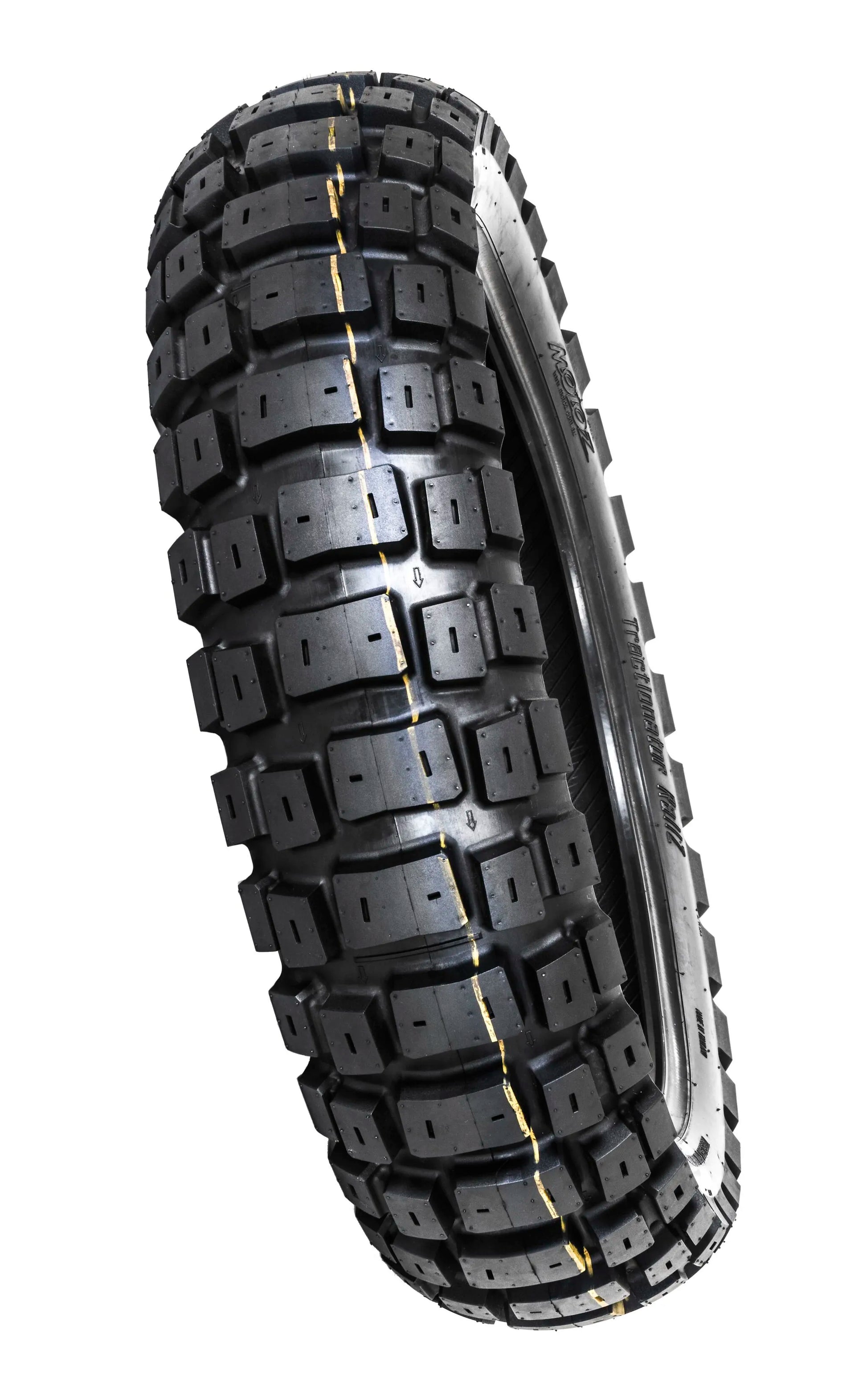 Extensively tested and proven in adventure and rally applications, the Tractionator Rallz features a robust construction and compound formulated for exceptional durability and performance. Developed in Australia, this tire delivers dependable performance across diverse terrains, eliminating the need for frequent pressure adjustments when transitioning between off-road trails and paved roads. The self-cleaning and self-sharpening tread pattern provides predictable handling and efficient power transfer. Its hybrid compound incorporates silica for optimized grip in mud and snow. Making it an excellent tire for desert and forest conditions. Available in tubeless and tube-type adventure sizes for lightweight adventure bikes. The Motoz Tractionator Rallz tire size is 150/70B18.