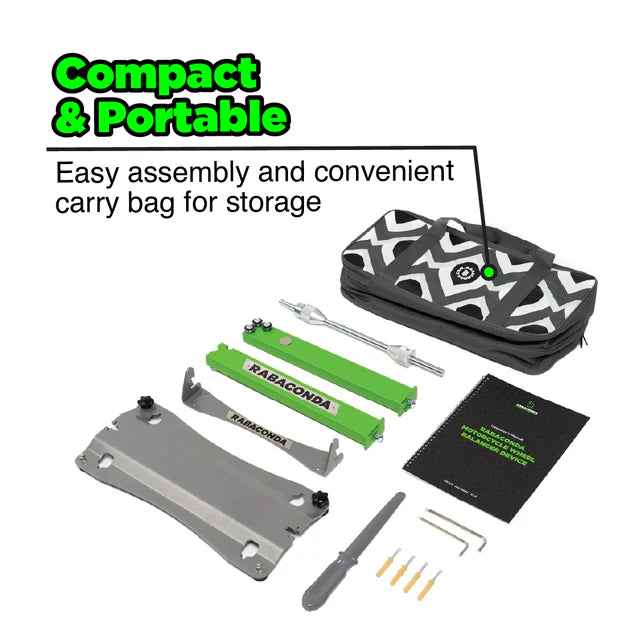Lightweight and portable, the Motorcycle Wheel Balancer can be assembled or broken down in seconds and can fit into a convenient carrying bag for storage or transport that, all in, weighs only 6,5 kg. It even features a small magnet for Allen key storage!