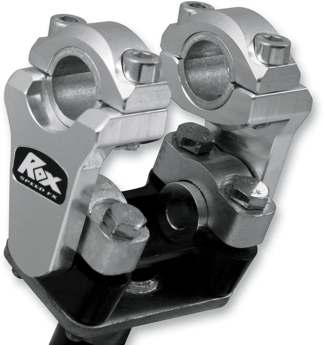 The Rox Speed FX Elite Pivoting Handlebar Risers feature a two-piece design that clamps to any machine with 7/8" handlebar clamps. You can clamp a stock 7/8" diameter handlebar, or remove the included reducers to accommodate a 1-1/8" aluminum handlebar. The reducers lock securely into the risers, preventing slippage between components, while serrated teeth maximize grip on the handlebar. These risers elevate your handlebars by 2" and offer pivoting fore and aft adjustment for a truly personalized riding position. The robust, outboard positioning enhances durability, ensuring these risers can withstand demanding riding conditions. These Rox Speed FX handlebar risers are proudly made in the USA, ensuring top-tier quality and craftsmanship. Upgrade your motorcycle with the Rox Speed FX Elite Pivoting Handlebar Risers for improved comfort, control, and overall riding enjoyment. Whether you're looking to improve ergonomics or increase control, these risers are a game-changer. Their innovative design and quality construction make them a must-have for any serious rider.