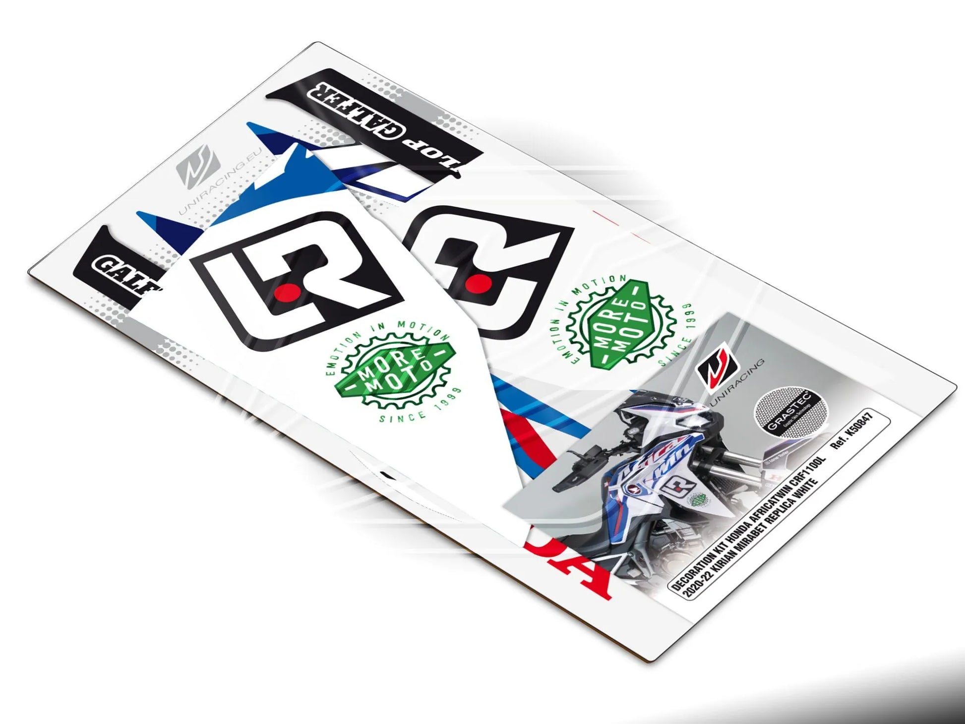 The Uniracing Decal Kit offers a premium solution for motorcycle customization and protection. Crafted from high-resistance vinyl, these decals are engineered to withstand the rigors of the road, providing exceptional resistance to rubbing and abrasion. The unique matte finish, achieved through an exclusive engraving process, delivers a sophisticated and attractive appearance. Designed for easy installation, this kit allows you to refresh your motorcycle's look with a professional-grade finish. The kit's comprehensive design ensures a perfect fit and seamless integration with your motorcycle's existing bodywork. Each piece is precisely cut to match the contours of your bike, guaranteeing a factory-like appearance.