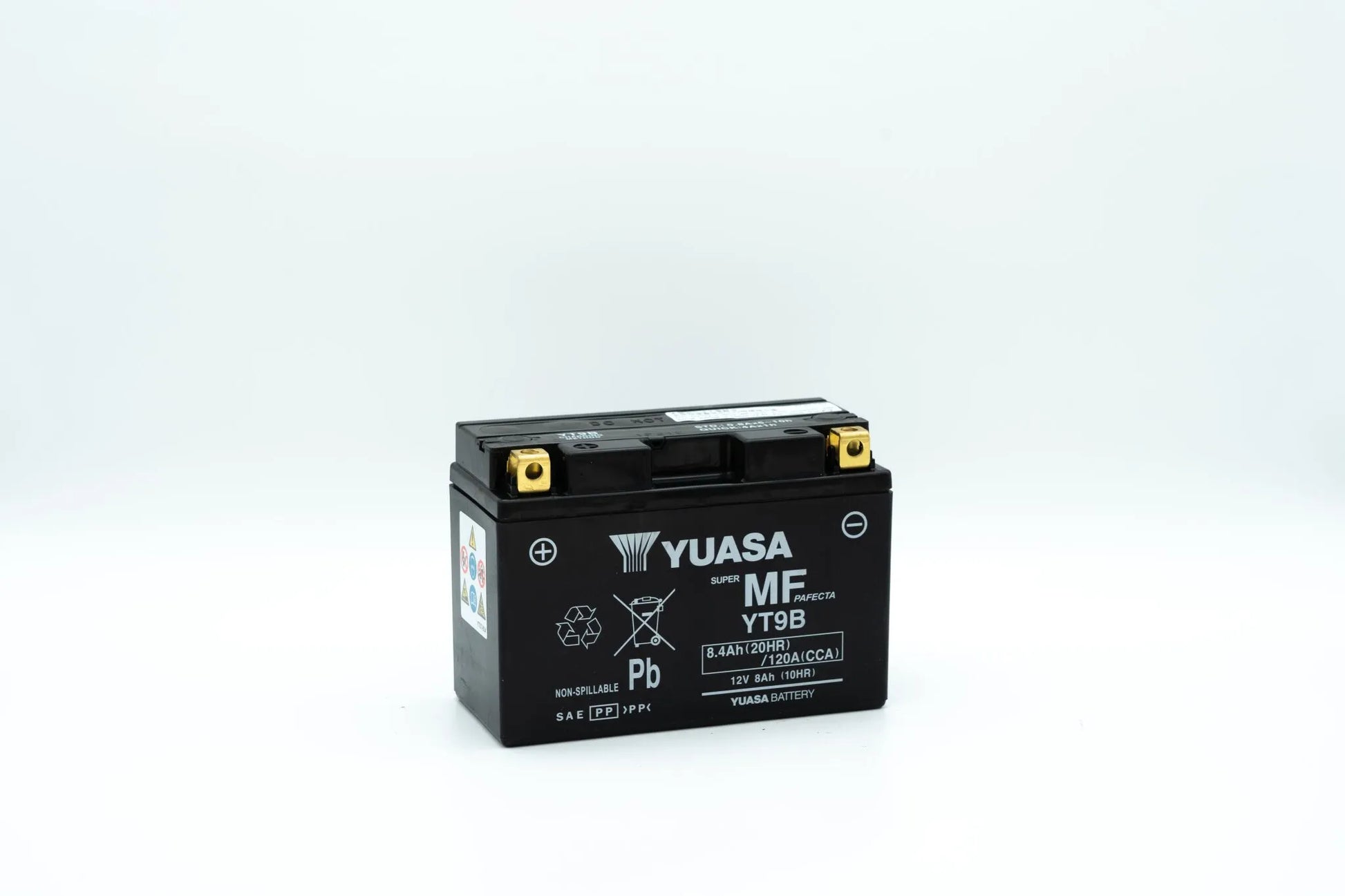 The Yuasa YT9B-BS is a 12V, 8 Ah AGM (Absorbent Glass Mat) maintenance-free battery designed for superior performance and longevity. Its spill-proof design eliminates the risk of leaks, while advanced lead-calcium technology ensures maximum starting power. The sulphation retardant significantly reduces plate sulphation, extending the battery's lifespan up to three times longer than conventional batteries. Featuring exceptional vibration resistance, the Yuasa YT9B-BS stands as the most reliable battery on the market today. VRLA (Valve Regulated Lead Acid) technology allows the battery to hold voltage longer and reduces the need for frequent charging during standby or storage. With a CCA (Cold Cranking Amps) rating of 120 A, this Yuasa battery provides the robust power needed for dependable starts. This battery is factory-activated and ready for immediate use. This AGM maintenance-free battery comes with a YT9B-BS reference number.