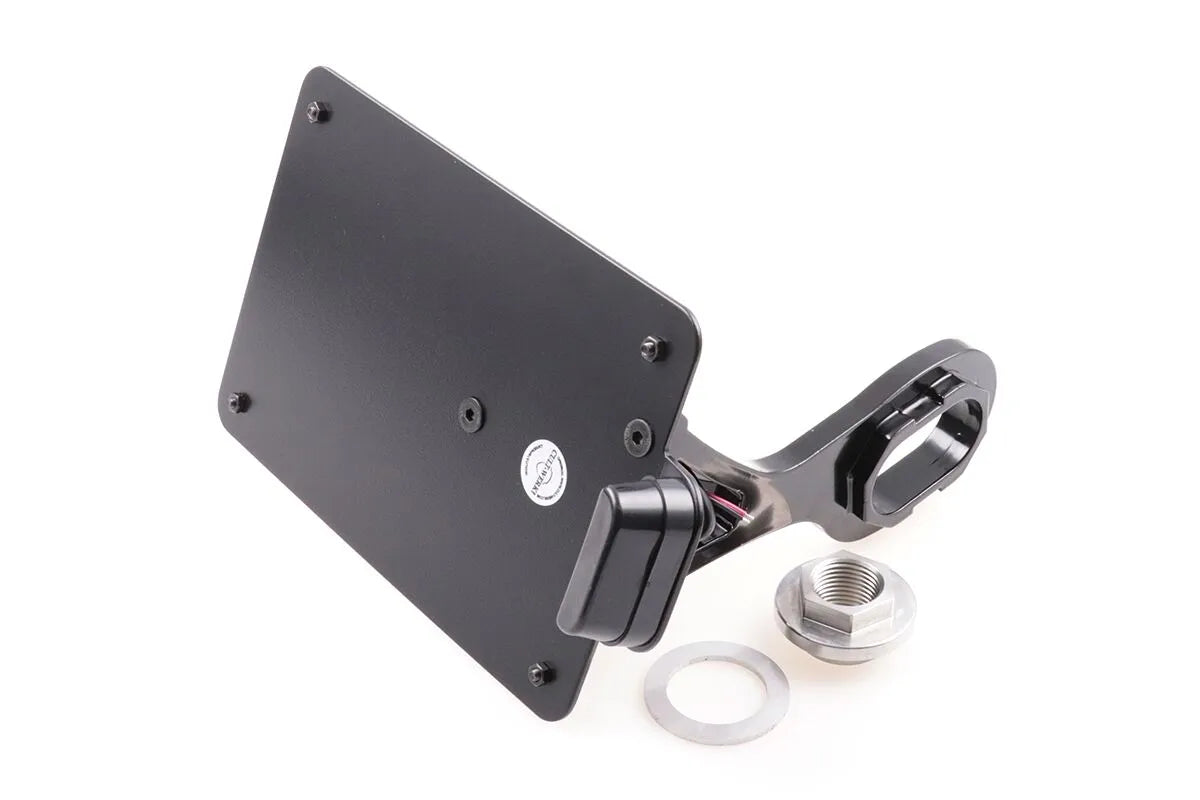 Crafted from high-quality steel, this license plate holder is CNC lasered for precision and then powder-coated in black for a clean, custom look. The robust construction ensures long-lasting durability and resistance to the elements. Installation is straightforward, providing a seamless upgrade to your bike's aesthetics. This holder includes an LED license plate light, ensuring visibility and compliance with regulations. The included LED light features an E-test mark, guaranteeing its quality and legality for road use. Enhance the rear profile of your motorcycle with this stylish and functional license plate holder from Cult Werk.