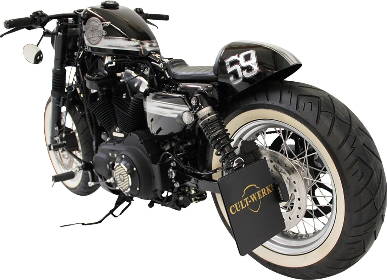 Crafted from durable, CNC-lasered steel and finished with a black powder coat, the Cult Werk License Plate Holder provides exceptional durability and a clean aesthetic. The included LED license plate lighting features an E-test mark, guaranteeing road legality and enhanced visibility. This license plate frame not only enhances the style of your bike, but it also offers a reliable and long-lasting solution for mounting your license plate. Easy to install and built to withstand the elements, this license plate bracket is a must-have for motorcycle enthusiasts looking to customize their ride with premium accessories. Enhance your bike's appearance and ensure compliance with the Cult Werk license plate bracket.Features & highlights