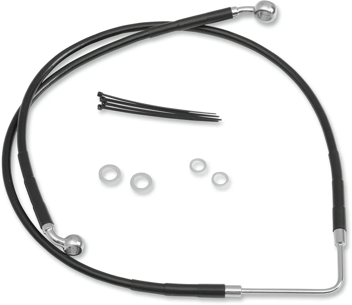 The Drag Specialties Stainless Steel Brake Line Kit is engineered for superior performance and longevity. Featuring braided stainless steel lines, this kit minimizes expansion under pressure, delivering a firmer, more consistent brake feel. The chrome steel fittings provide a secure and corrosion-resistant connection. Designed and manufactured in the U.S.A., this brake line kit meets the highest standards of quality and reliability. The black vinyl coating adds an extra layer of protection against abrasion and the elements. Installation is straightforward, providing a direct replacement for your original brake lines. Improve your motorcycle's braking system with this premium-quality brake line kit.