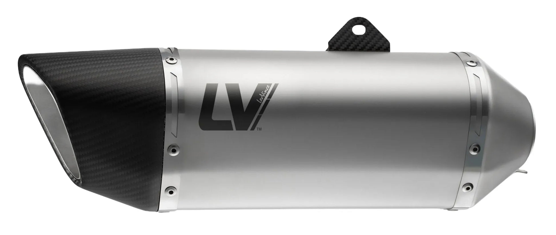 The LV-14R slip-on muffler features a special high thermal resistance packing material, meticulously hand-assembled around a straight-through internal muffler core equipped with a removable db-killer. This design delivers the signature LeoVince sound, enriching your riding experience. Constructed from durable stainless steel with a titanium look finish, this slip-on muffler is designed for longevity. All TIG welds are handcrafted by skilled technicians, ensuring resistance and reliability. The end cap is made from carbon fiber and features a conical style and a black finish. Installation is simplified with its slip-on design, integrating seamlessly with your bike's existing exhaust system.