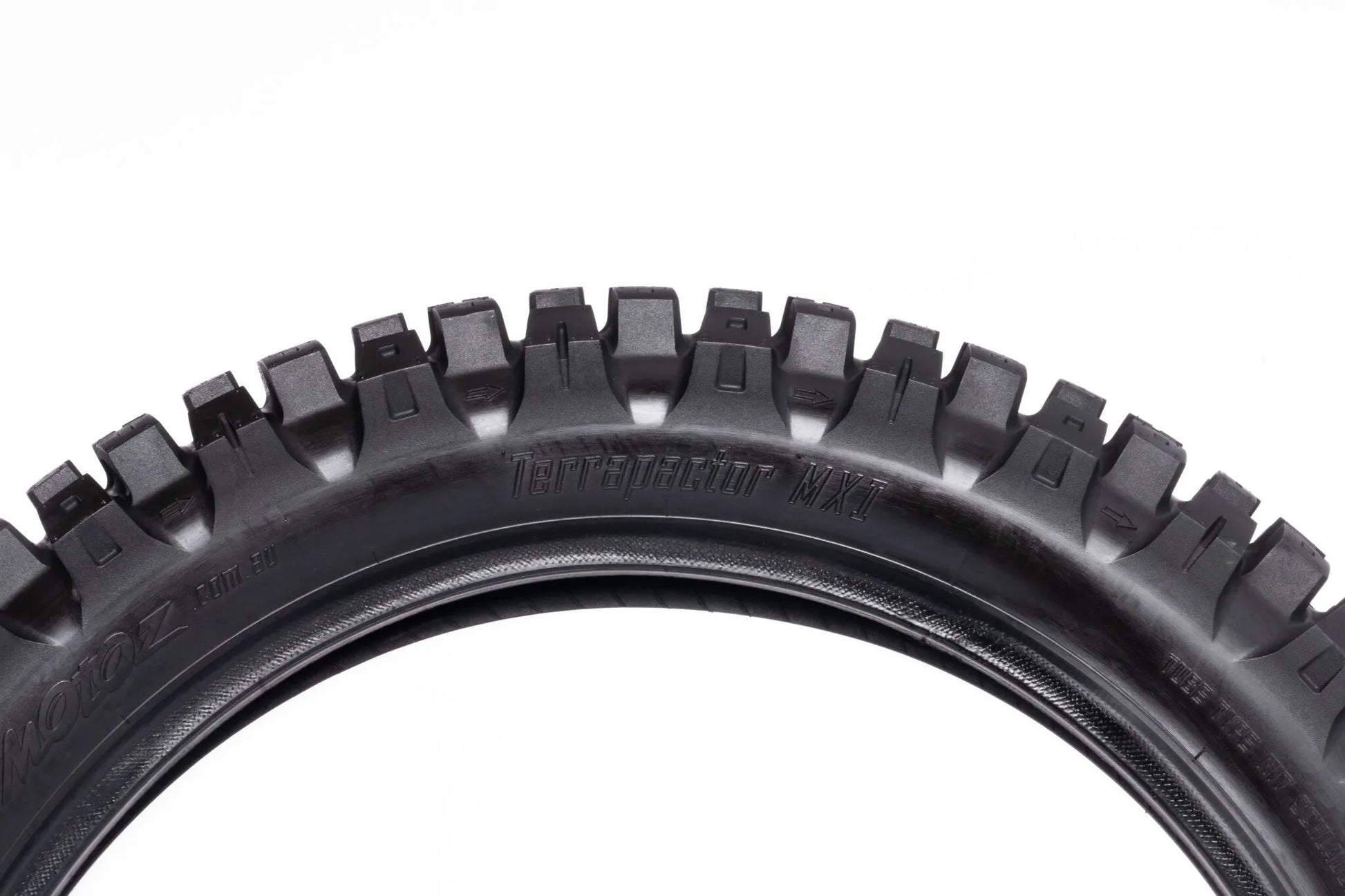 The Motoz Terrapactor Mxi is the latest addition to the Motoz MX tire lineup, designed to excel in challenging conditions. Its lightweight carcass and strategically engineered tread pattern provide optimal performance on a mix of loose and packed soil, hard-packed surfaces, and deep ruts. The unique tread design incorporates flex points within the carcass and knobs, delivering enhanced cornering grip and predictable handling. Experience superior control and confidence with a tire that adapts to the terrain, providing consistent performance across various track conditions. Available in a full range of sizes to fit mini-cross bikes to big bikes, including front sizes 80/100-21 for aggressive performance and 90/100-21 for increased contact and feedback.