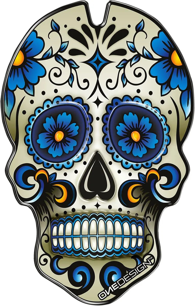 This premium tank pad is molded from durable resin and features a self-adhesive backing for easy and secure installation. The resilient resin construction provides excellent protection against everyday wear and tear, preventing damage to your motorcycle's paint. The eye-catching skull graphic, rendered in blue, white, and multi-color, adds a custom look to your machine. Designed for universal fitment, this tank pad easily installs on most sport, touring, and road motorcycles. Installation is a breeze thanks to the self-adhesive backing; simply clean the application area, peel, and stick for instant protection and style. Ensure your motorcycle's tank remains pristine with this stylish and functional accessory.Features & highlights